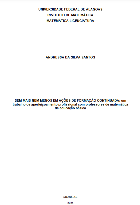 Desde 2016, o grupo de extensão "Sem mais nem menos" da Universidade Federal de Alagoas (Ufal) desenvolve atividades voltadas para estudantes e professores de matemática da Educação Básica, mostrando a presença da matemática aplicada ao cotidiano. Em 2023, o projeto desenvolveu duas ações de formação continuada para professores de matemática, a etapa on-line de 2023 e o curso de formação continuada presencial. A etapa on-line de 2023 foi realizada por meio de lives e webconferências, assim como em 2020. As lives apresentaram 04 (quatro) materiais didáticos, sendo eles "Jogo ludo: a matemática na construção do tabuleiro"; "Brasileirão: um estudo das classificações"; "Tiktok: construindo um isotipo por meio do desenho geométrico" e "Aprendendo ganhos e perdas na trilha financeira". Esses materiais didáticos, ao serem apresentados em 03 (três) webconferências, mostraram aos professores as defasagens dos estudantes em conceitos de geometria, números e no manuseio do compasso, isso após serem verificados os itens e questionamentos respondidos pelos estudantes depois da apresentação dos materiais didáticos. Já a segunda ação, o curso de formação presencial, foi realizado no Laboratório de Ensino de Matemática (LEMa) no Instituto de matemática da Universidade Federal de Alagoas (IM - Ufal). Durante o curso, ocorreram 04 (quatro) momentos formativos, em que os professores conheceram 03 (três) materiais didáticos que compõem a temática "Matemática nas brincadeiras de infâncias", intitulados de: "Pega varetas: trabalhando as operações matemáticas com as cores; "Pular elástico: brincando com a geometria" e "Cama de gato: o barbante e a geometria". Além de testarem esses materiais, os professores desenvolveram e aplicaram aos seus estudantes 02 (dois) materiais com a mesma proposta. Essas aplicações mostraram as defasagens dos estudantes nas operações básicas e em probabilidade. As ações mostraram empecilhos e desistências por parte dos professores, mas os momentos formativos possibilitaram a verificação das defasagens dos estudantes e a reflexão por parte dos docentes sobre suas práticas pedagógicas, principalmente em como apresentar uma matemática mais próxima da realidade dos estudantes.